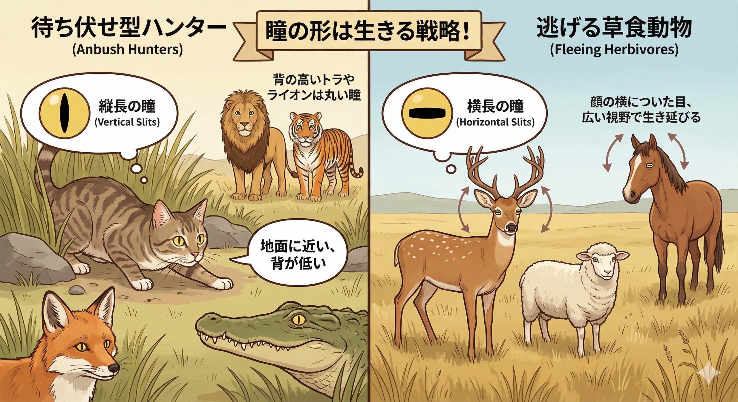 縦長の瞳で正確に狙いを定めるハンターも、横長の瞳で広い世界を警戒する草食動物も、どちらも自分の生きる環境に合わせて「最高の形」に進化してきたんだね。