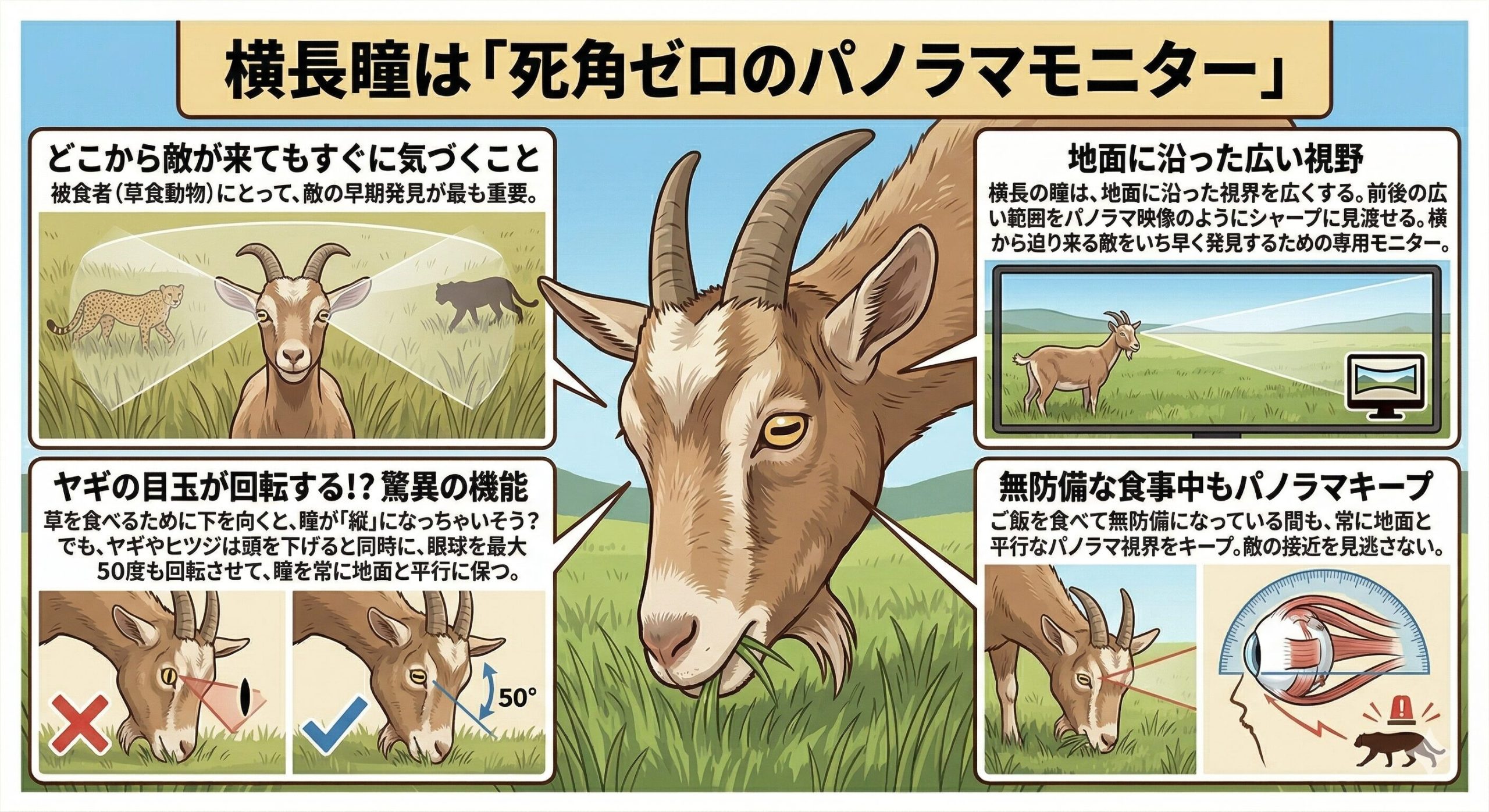 でも、ヤギやヒツジは頭を下げると同時に、眼球をクルッと最大50度も回転させて、瞳を常に地面と平行に保つ(回旋運動)ことができるんだ!