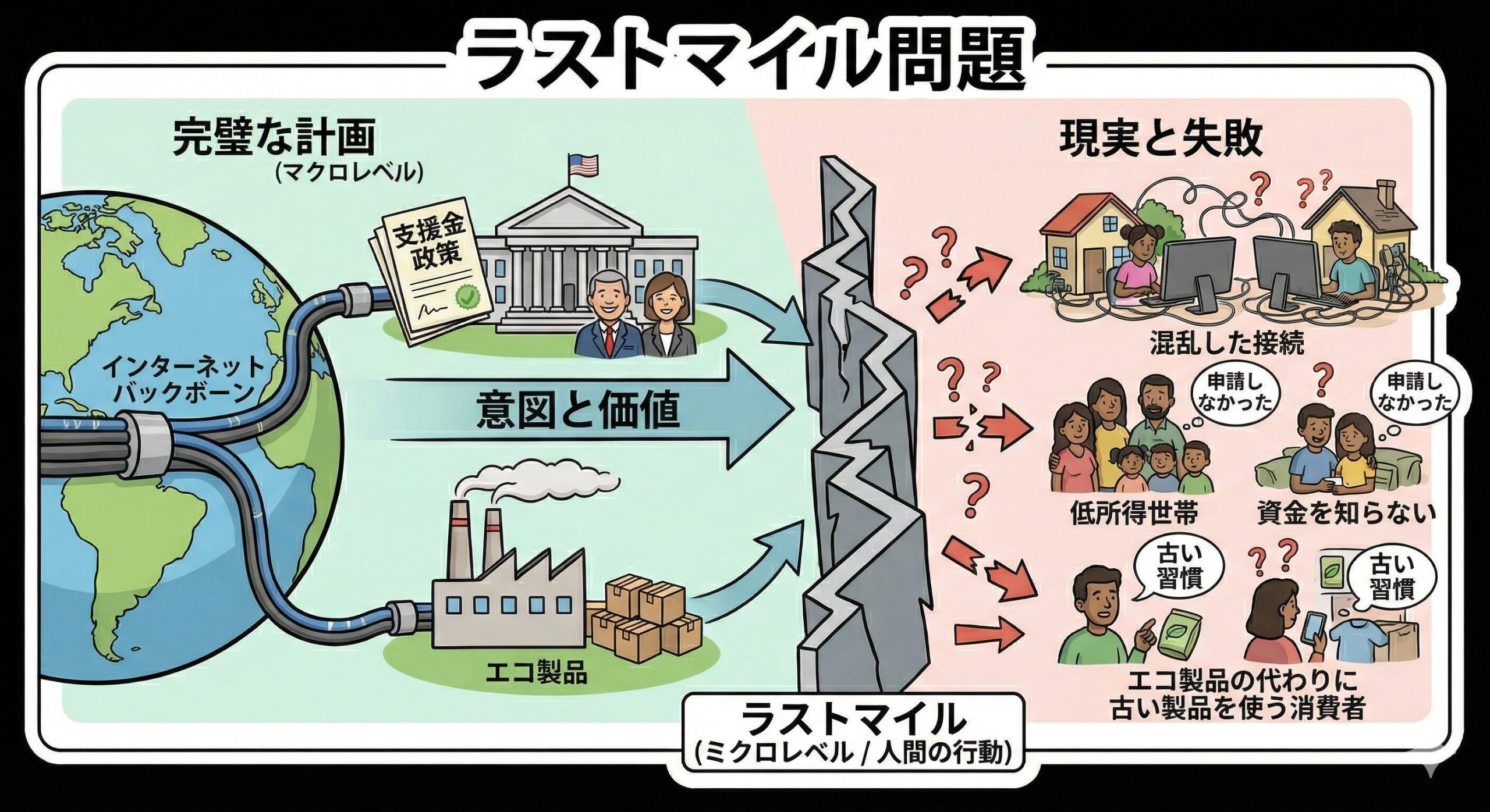 政府が「低所得者向けの素晴らしい支援金制度」を作ったり、企業が「環境に超優しいエコな製品」を開発したりしても、なぜか誰も使ってくれない。意図も価値も完璧に設計されているのに、人々の「行動」に変わる最後の最後、つまりラストマイルで大コケしてしまうんだね。