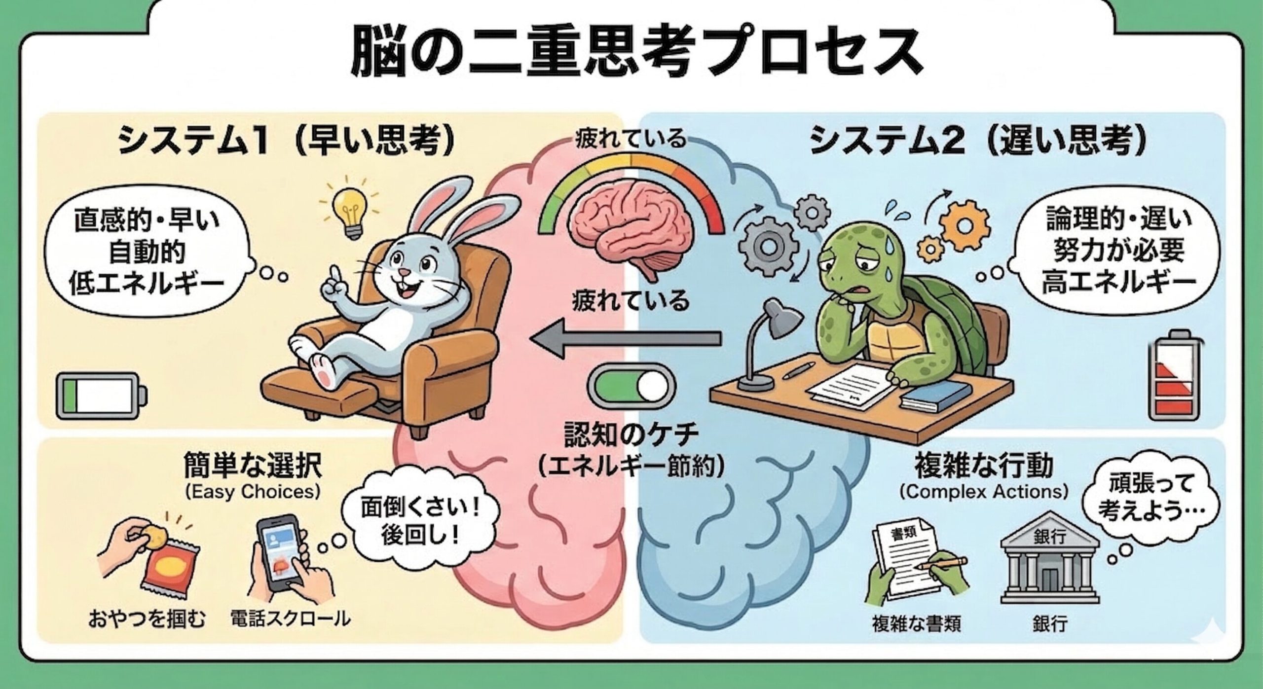 複雑な書類を読んだり、普段行かない銀行に行ったりする行動は、エネルギーを大量に消費する「システム2」を使わなきゃいけない。でも、脳はエネルギーを節約したがる「認知のケチ」だから、疲れているとすぐにシステム1が「面倒くさい!後回し!」って判断を下しちゃうんだ。