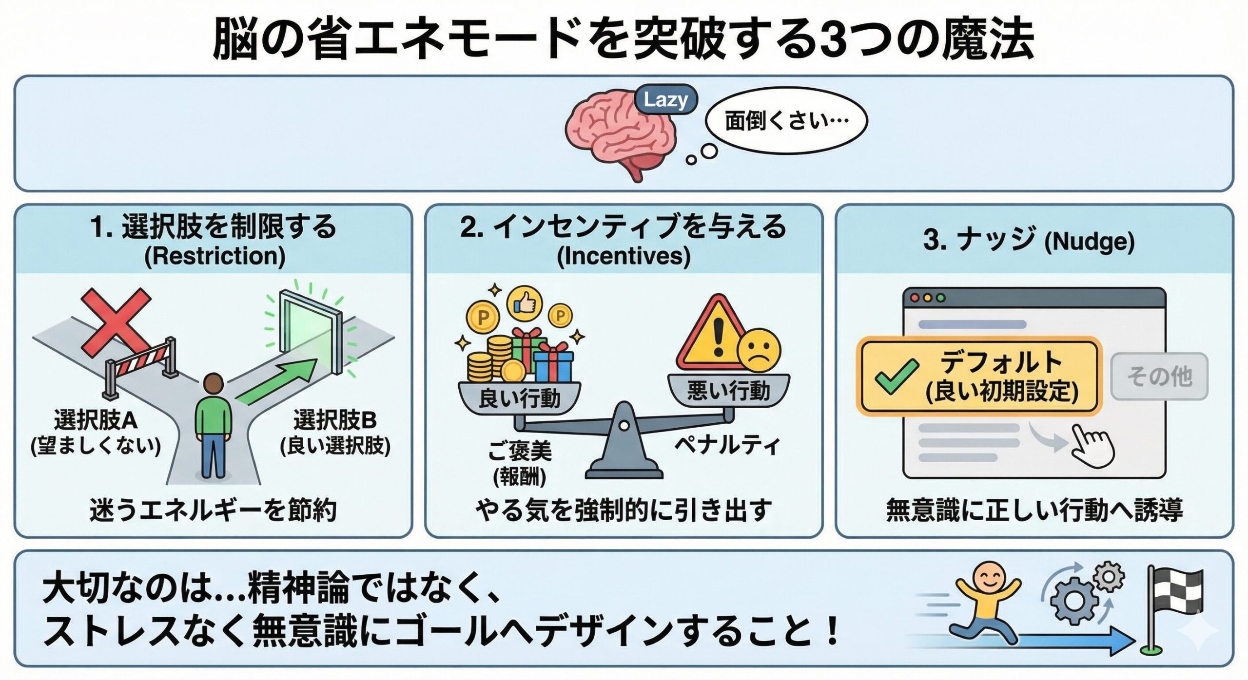 • インセンティブを与える(Incentives):良い行動をしたらご褒美(お金やポイントなど)をあげたり、悪い行動にペナルティを課すことで、システム2の「やる気」を強制的に引き出す。