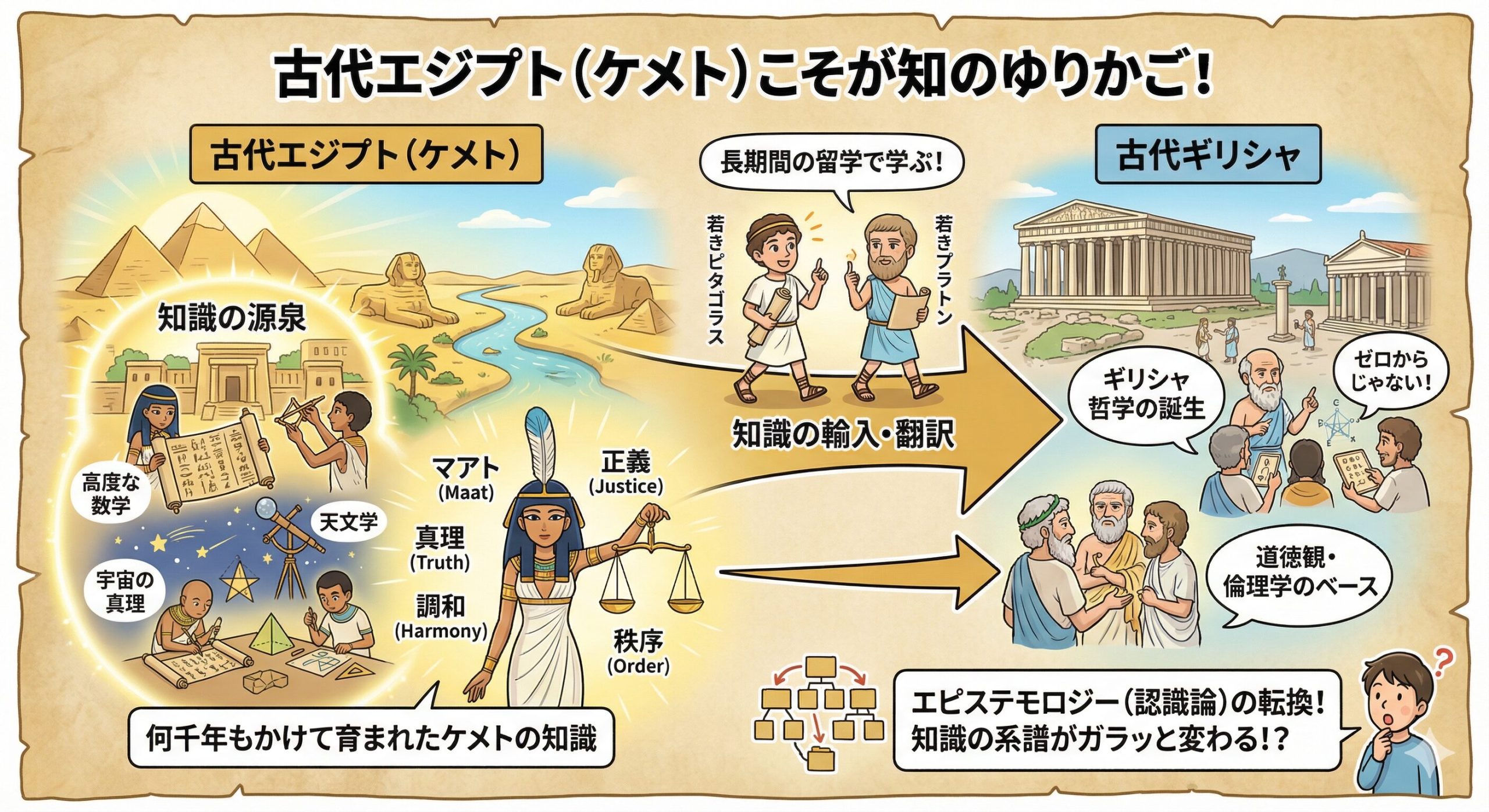 ケイタによれば、この「マアト」のような思想こそが、のちのギリシャ哲学における道徳観や倫理学のベースになっているんだって。 これをエピステモロジー(認識論)の観点から見直すと、僕たちの「知識の系譜」がガラッと変わって見えてくるよね。 (※エピステモロジーっていうのは、人間がどうやって物事を知るのか、知識の起源や限界を探求する哲学の分野のことだよ!)