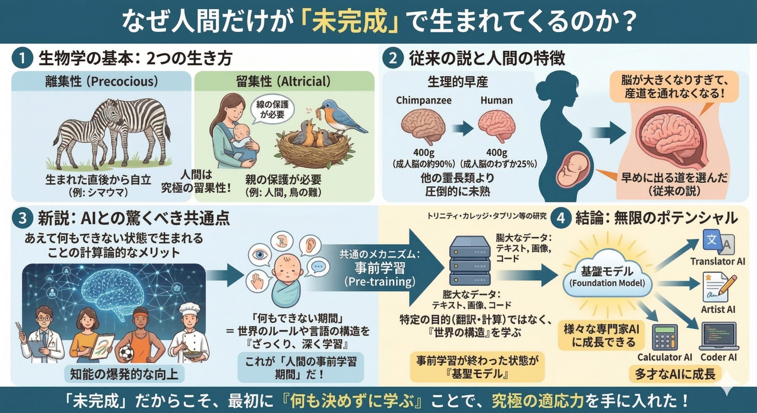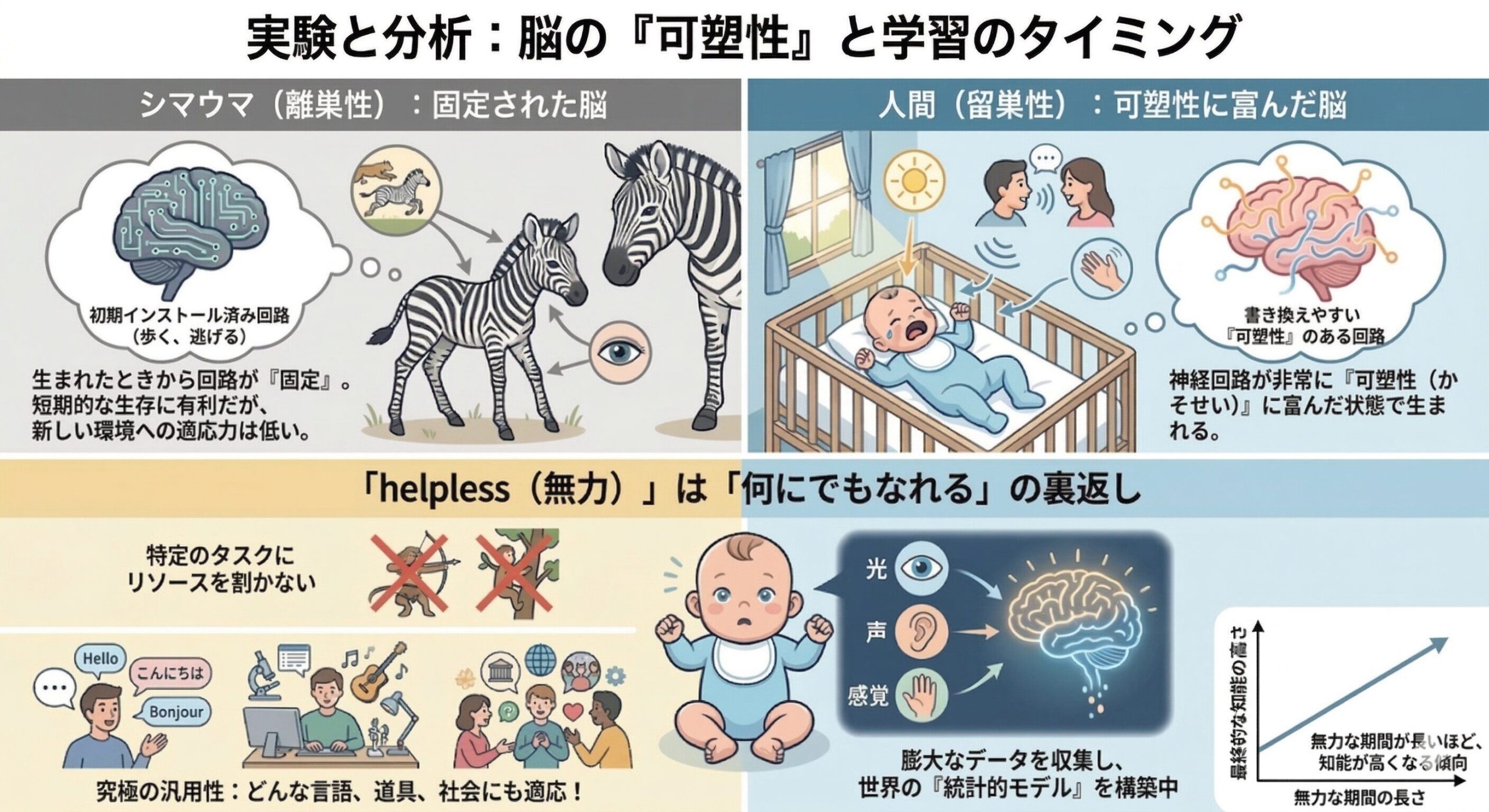 彼らは、「あえて何もできない状態で生まれること」には、知能を爆発的に高めるための計算論的なメリットがあると考えたんだよ。