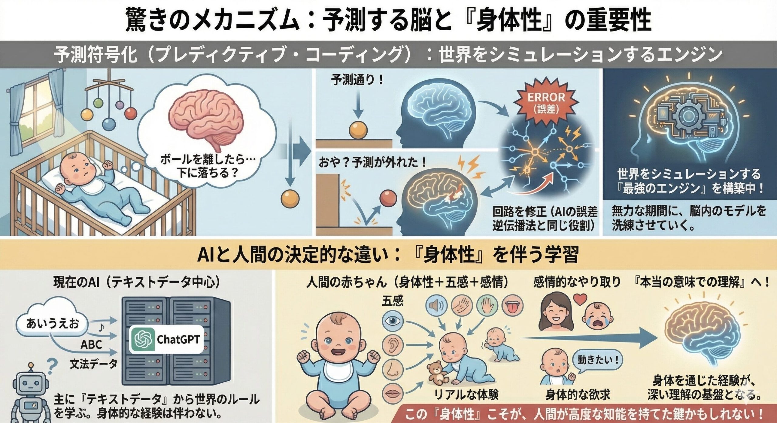 ChatGPTのようなAIは、主に「テキストデータ」から世界を学んでいる。でも赤ちゃんは、五感を通じたリアルな体験や、親との感情的なやり取り、そして「動きたい!」という身体的な欲求をセットにして学んでいるんだ。