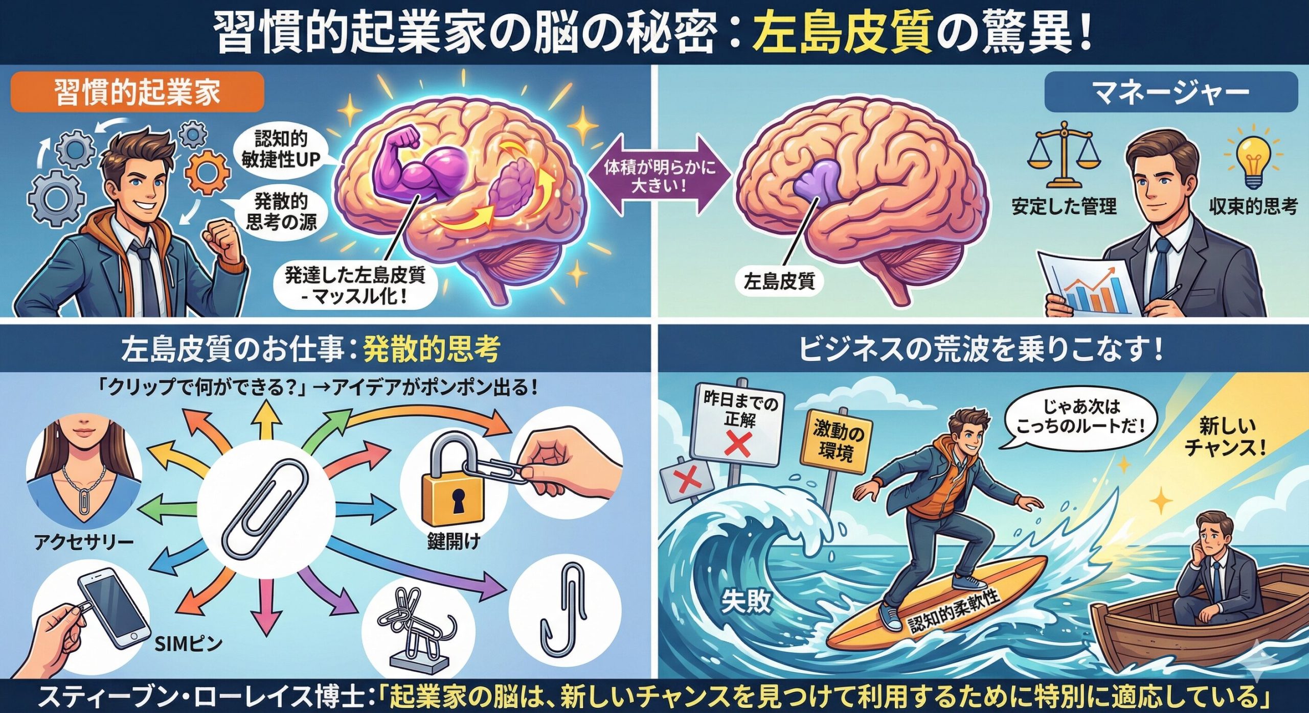 何度も新しいビジネスを立ち上げるような「習慣的起業家」たちの脳は、マネージャーたちの脳と比べて、「左島皮質(ひだりとうひしつ:Left insula)」という領域の灰白質(ニューロンが密集している部分)の体積が明らかに大きかったんだ。