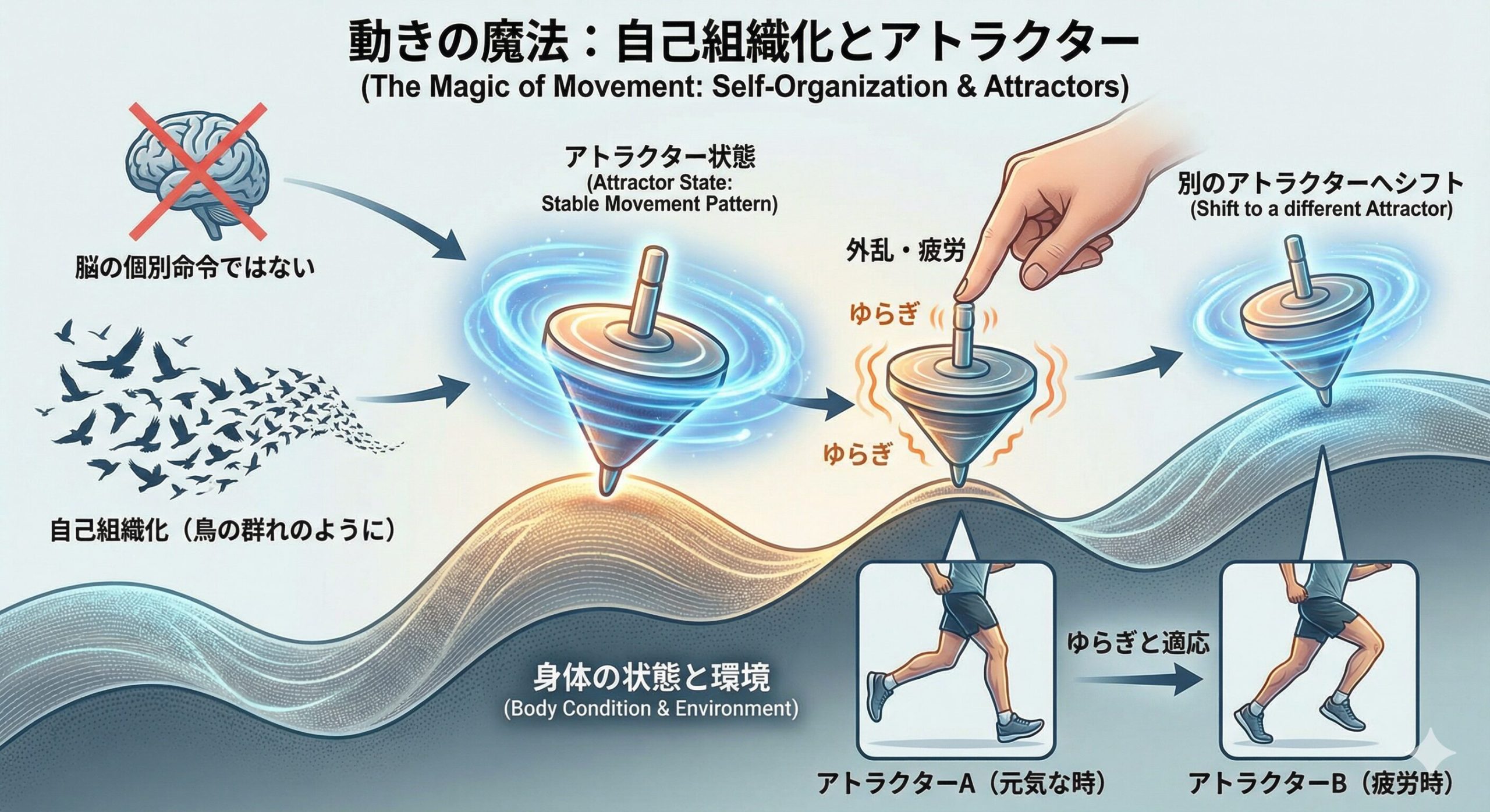 コマが回っているときに、ちょっと指で突っついてもゆらゆら揺れながらまた安定して回り続けるでしょ?あんな感じで、強い風が吹いたり地面が少しデコボコしていたりしても、身体は「ゆらぎ」ながら瞬時に別のアトラクター(走り方)にシフトチェンジして、最適なバランスを保ち続けているんだね!
