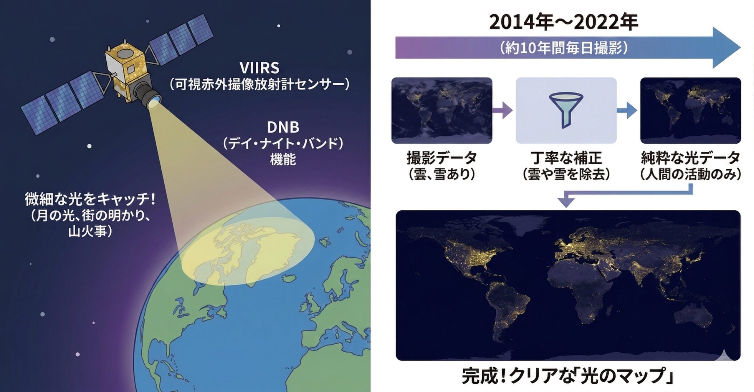 研究チームは、このVIIRSを使って、2014年から2022年までの約10年間にわたって、地球全体の夜の明るさを毎日毎日撮影し続けたの。